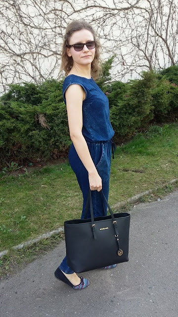 Kombinezon połączyłam z niezobowiązującą marynarka, ale na pewno dodającą całemu stroju odrobinę elegancji. Do tego duża, czarna torebka - to u mnie podstawa gdyż na co dzień dużo ze sobą noszę. Zamiast czarnych butów, wybrałam model bardziej wakacyjny, który idealnie pasuje do słonecznej pogody. Wydaje mi się, że całość tworzy ciekawą, codzienną ale nietuzinkową stylizację.